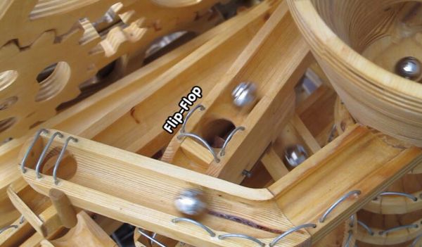 The bearings run in all different directions. First they drop into a vortex funnel (or flower pot), which spins them and sends them on one of two possible tangential paths or down a spiral track. The paths from the vortex funnel lead to the zigzag tracks or a flip-flop mechanism. The bearings exit the vortex at high speed unless they don't hit the exit hole squarely, then they have a delayed exit, until the next one comes along and crashes into it or until it finds the center hole.