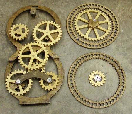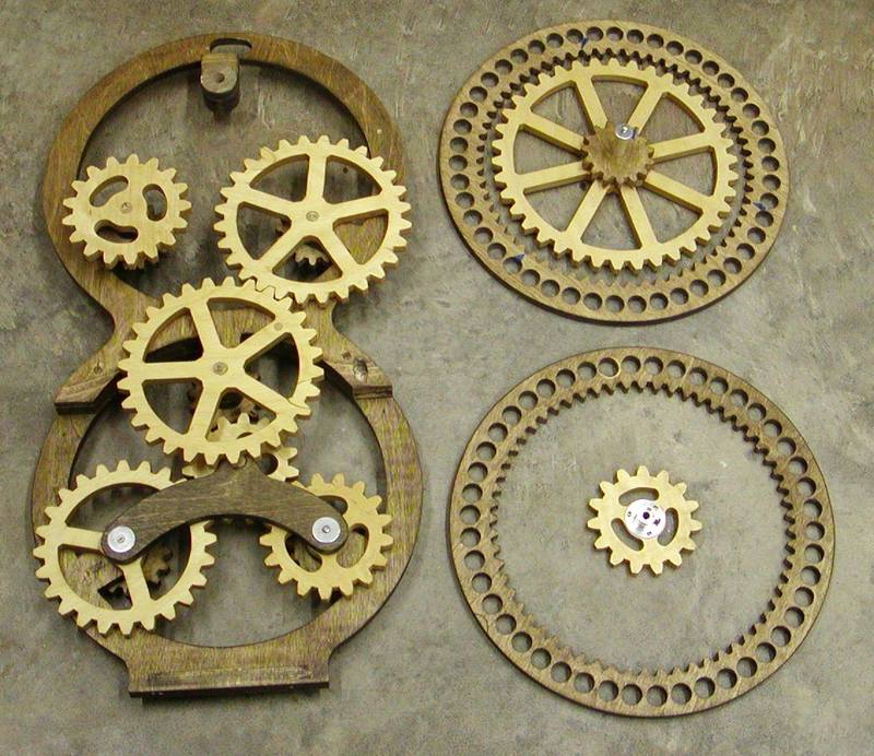 There are 16 gears hand-cut from 1/2" Baltic Birch plywood driven by an electric