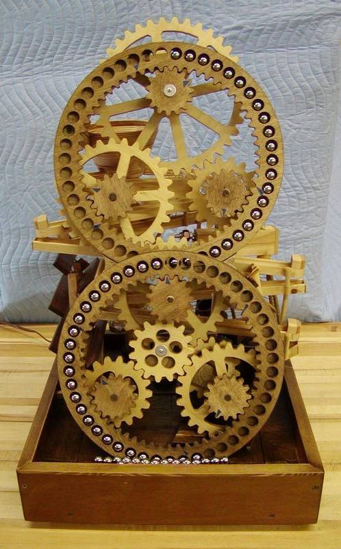 The Marble Machine weights 30 pounds, stands 30 inches high, the base is 19" square and the ring gears are 14-1/2" diameter. It moves over 7000 bearings per hour and holds with 75 bearings.