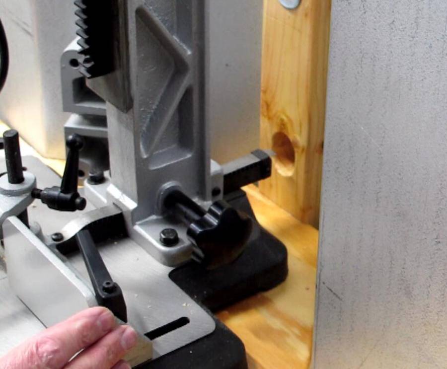 The mortiser fence is positioned with a rack and pinion mechanism. I