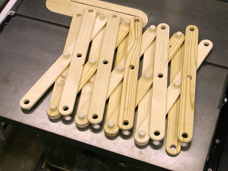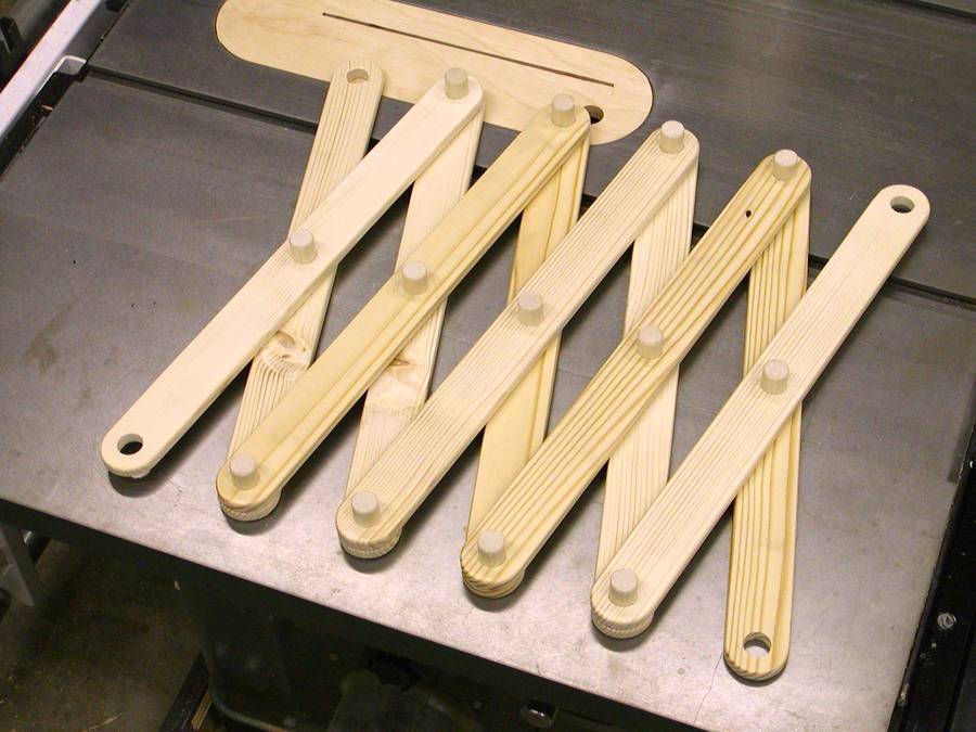 Make sure the holes in the moving slats are smooth and all slats move smoothly on the pins when assembled. Completely assemble the scissors and test for freedom and range of movement. Occasionally a slat will bow or warp and will not work in the assembly.
