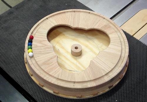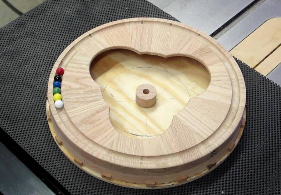 The track was routed into the wood using a 5/8" diameter core box bit. The white marbles are slightly over 9/16" diameter while the smallest red ones are well under 9/16" diameter.