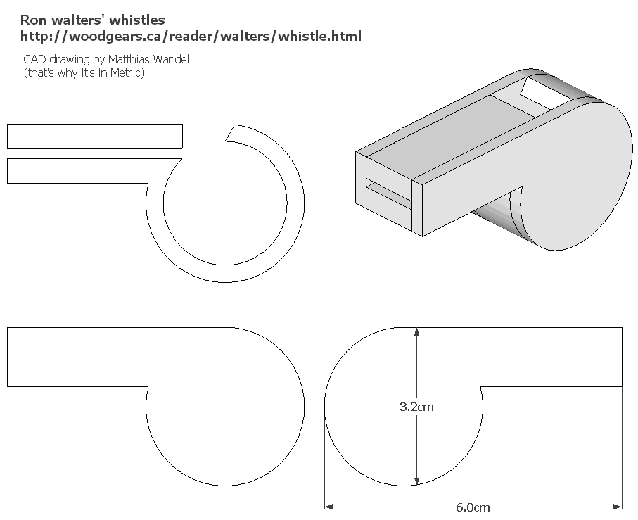 I have CAD captured the whistle, but did the drawing in metric. You can make a 1:1 printout of the drawings at left by downloading the eval version of my BigPrint program and just dragging the image at left onto the program. Or you can print the print the pdf. You can alslo download the whistle SketchUp model