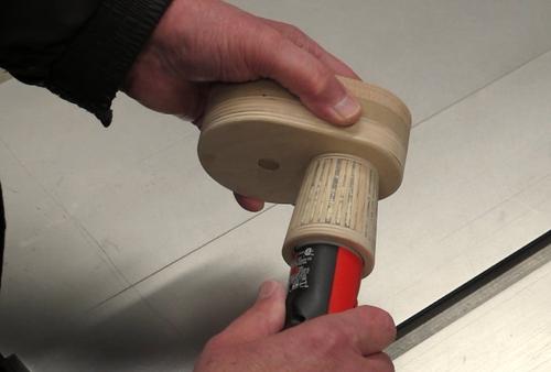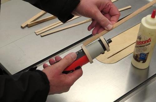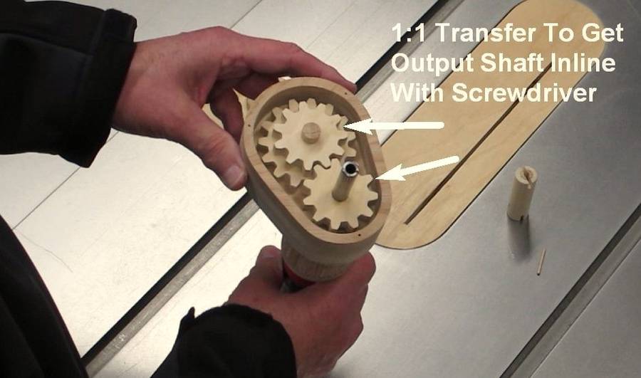 Construction starts with a couple of plywood rings with the inside surfaces tapered slightly so they fit snugly on the end of the cordless screwdriver (Black & Decker 2.4 Volt Model DP240 shown). Plastic wrap was placed over the screwdriver prior to assembly to prevent glue sticking to the screwdriver. Strips of wood cut to length and glued around the screwdriver to form the housing. The Slots were then filled with a mixture of sawdust and glue and the housing sanded smooth. The housing should fit firmly with a light twisting motion, no clamping required. I fabricated a gearbox to suit the gears used, and attached it to the screwdriver housing.