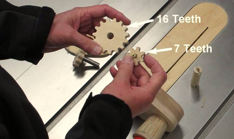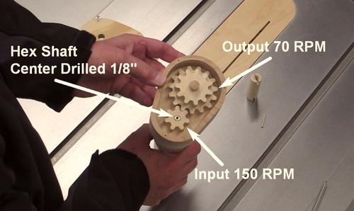 The screwdriver turns at 150 RPM, which is too fast for winding the clock. I used Matthias's Gear template program to make 16-tooth and 7-tooth gears to reduce the speed to 70 RPM. I really like the program feature, which allows you to select the shaft spacing. A hex shaft (center drilled 1/8") was epoxied into the pinion shaft.
