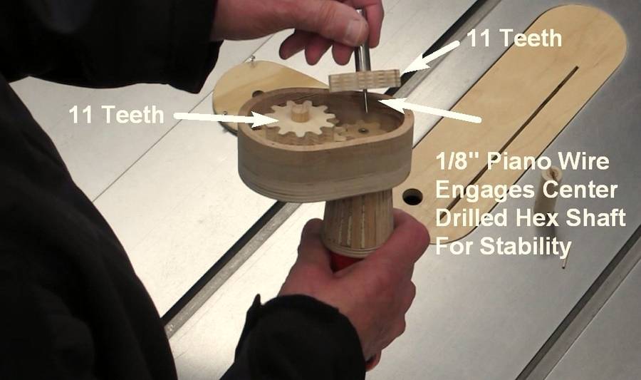 I wanted the output shaft to be inline with the screwdriver so it would be easy to use. I made two 11-tooth gears, one glued to the top of the 16-tooth gear and the other epoxied to the output shaft. A 1/8" piano wire was installed in the end of the output shaft. The 1/8" wire runs inside the hex shaft hole, holding the bottom of the output shaft in place. The top end of the output shaft is held by the gearbox lid. The two 11-tooth gears provide a 1:1 speed transfer and reverse the rotation to the original screwdriver direction of rotation.