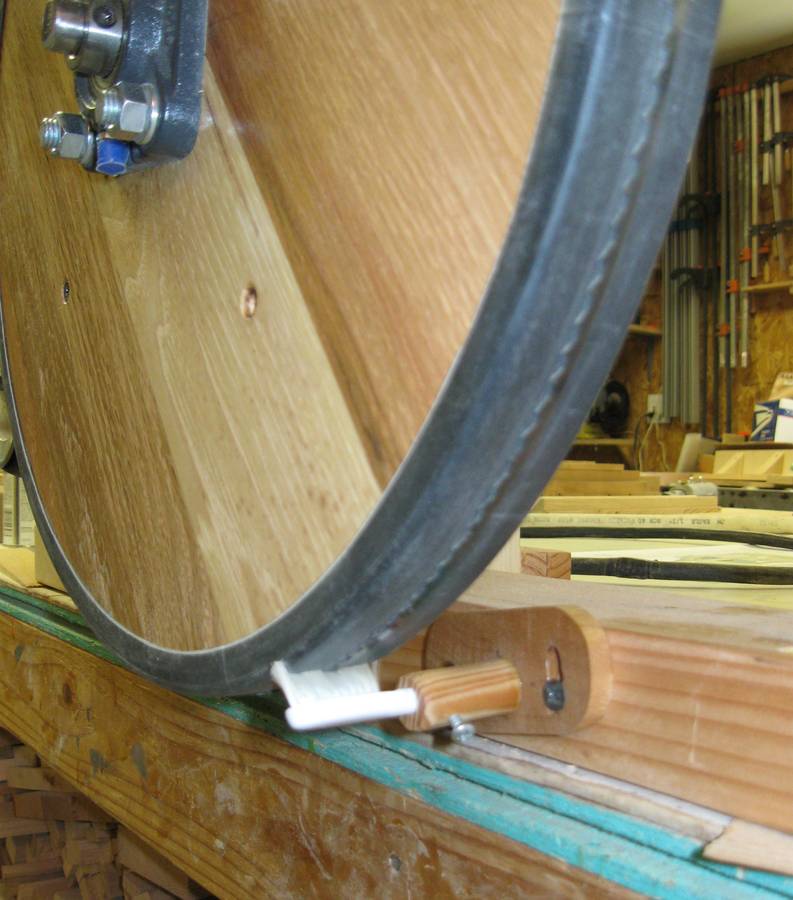 The tooth brush sawdust remover is low tech but it works. The belt guard, and guard around the bottom wheel is made from 3/16" plywood. The stand is made from more of the barn wood and the 3/16" plywood. The saw just free stands on its base. I still need to build a drawer to catch the sawdust and another one or two drawers for storage in the base.