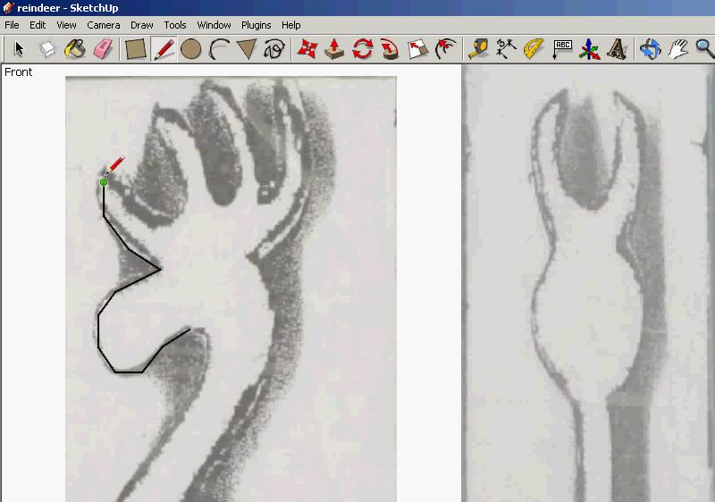 So I started by importing a photo of the pattern into Google SketchUp and tracing an outline of the reindeer using the photo as a template. I know there are programs that can automatically trace an outline, but these outlines weren't really clean enough to even consider doing that, and it didn't take long to trace it out by drawing lines with the mouse.