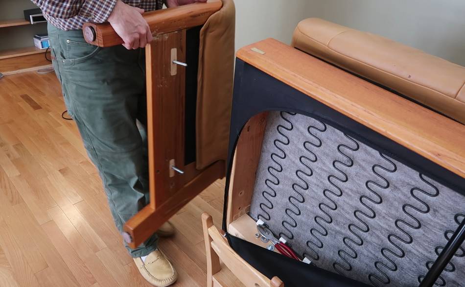 The bottom of the couch zippers open (it's a fancy couch), and two nuts hold