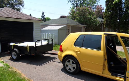 And there I was in the midst of all that, with my little yellow car and trailer, sweating in the heat and humidity as I pried the shingles off my trailer.