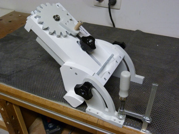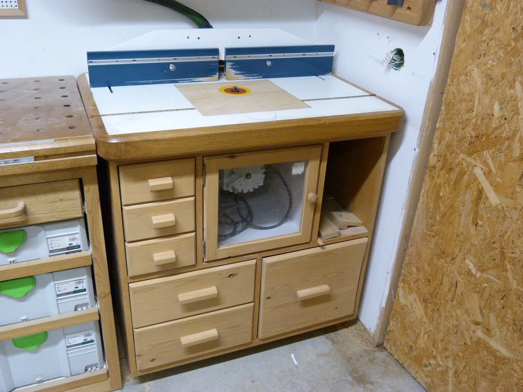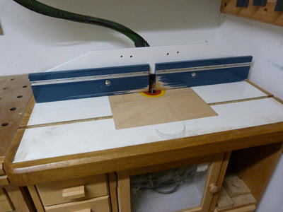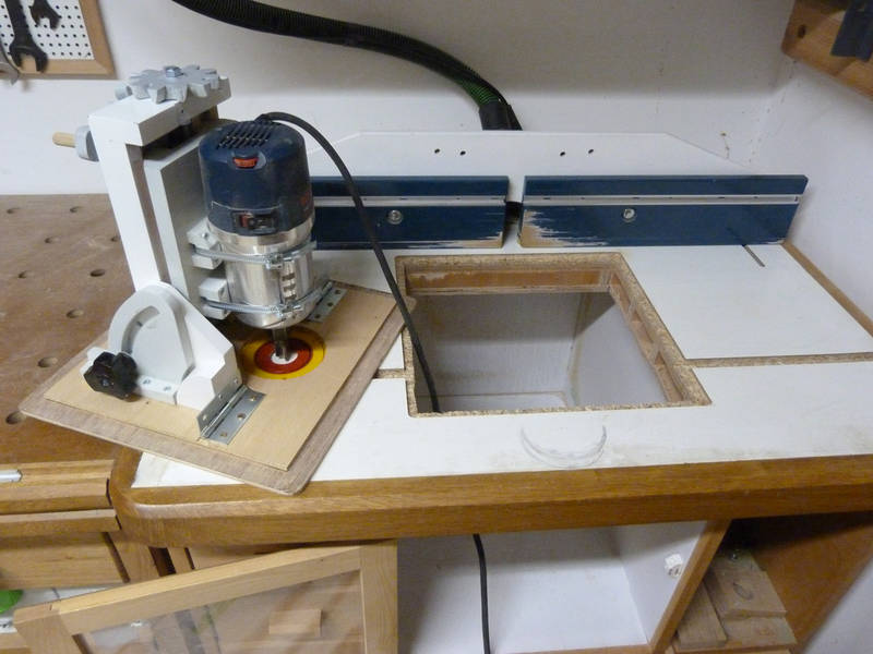 Matthias comments: I tried to keep the design compact so it would fit in a router table of this style even though I don't have room for a router table in my shop. I hadn't thought about T-tracks. So far never had a need for a coping sled, and if I did, I'd probably just run it along the fence instead. I really like how your router lift looks - the paint job came out very nice.