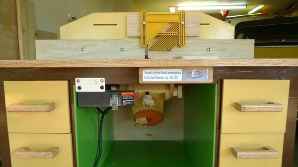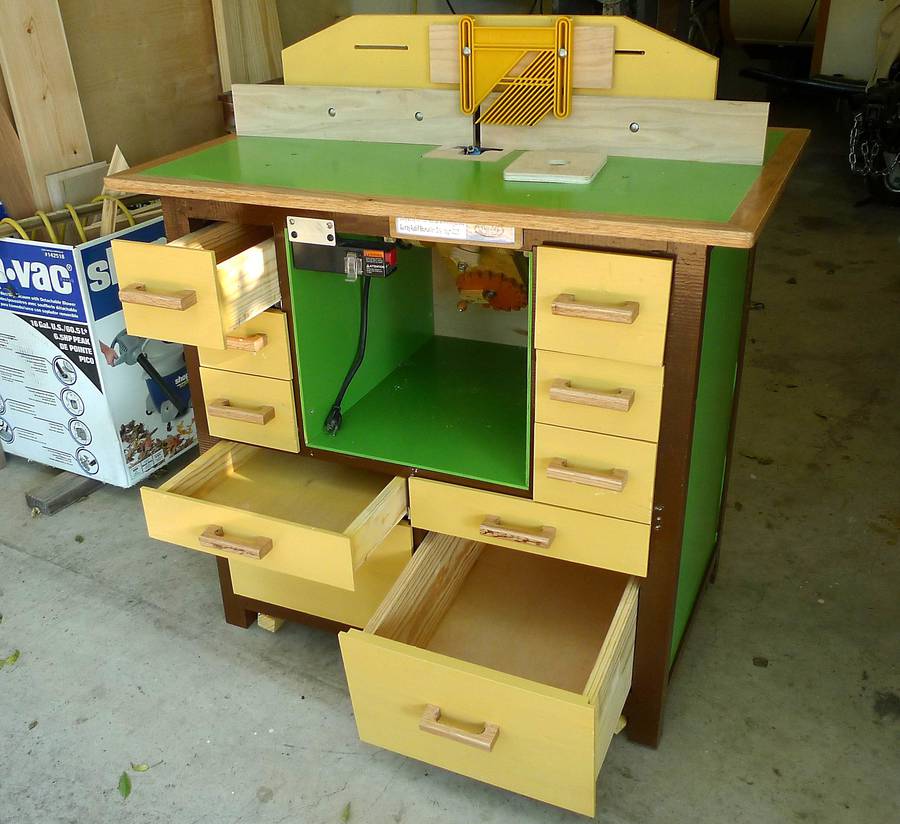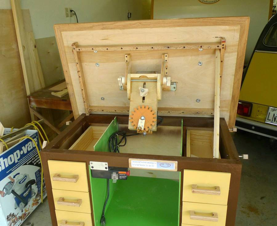 Matthias comments: Love it! But the router table is actually not my design, I just drew up the plans based on photos and overall dimensions from Dejan Kovac's router table Nice to see construction photos of this router table. Especially because I didn't actually build one of these myself! I don't have room for a dedicated router table in my workshop, so my tilting router lift is mounted to my old table saw. I have added a set of wheels to the table partly of your design, but I made it lift the table more directly by just rotating the beam where the wheels are mounted by 90 degrees using the long handle in the back of the table. Even with all the drawers loaded with tools, it lifts easily, and can be rolled around, holding onto the lifting handle just to make sure it does not sit down. See also:
