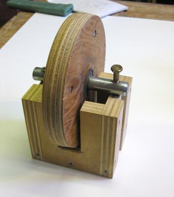 The bottom shaft is from a scrapped electric motor, perfect for this job because it has machined fits for two standard bearings, a spline in the center to press into the plywood wheel and a machined end to receive the drive pulley. The springs you see used to be elastic bands hooked over dowels glued in where the screws now are.