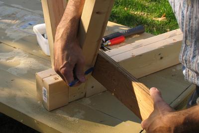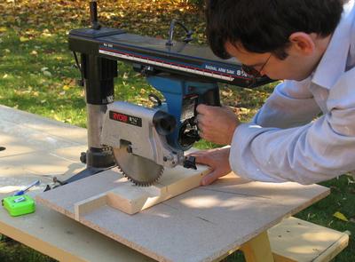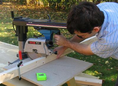 There seems to be as many variations on sawhorse designs as there are woodworkers. So it should only figure that I would have a sawhorse design of my own too. Though really, it's not much of a design. Just as simple and sturdy a sawhorse that I could come up with. The emphasis being on light, sturdy, and stackable. Disassemble-able would be nice too, but that would compromise the other factors, and at that point, its probably better to just buy one of many types of sawhorse brackets and use those. The only tool you need to build these is a sliding miter saw, or a radial arm saw. I used a radial arm saw, because that's what I have. I would recommend you buy a sliding miter saw instead. The way a radial arm saw pulls itself into the wood and with the saw blade coming towards you, is ideally suited for having horrific accidents with. Miter saws are much safer, and can do nearly anything practical that you could do with a radial arm saw.