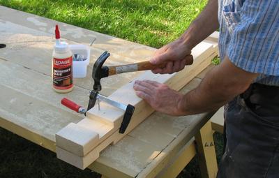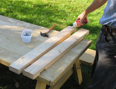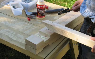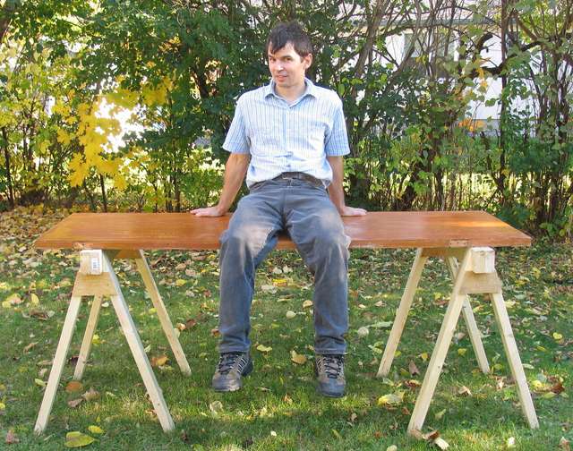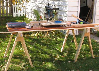 The cross beams on top of the sawhorses consist of two 2x4's 3 foot in length.