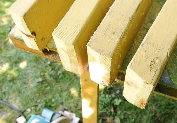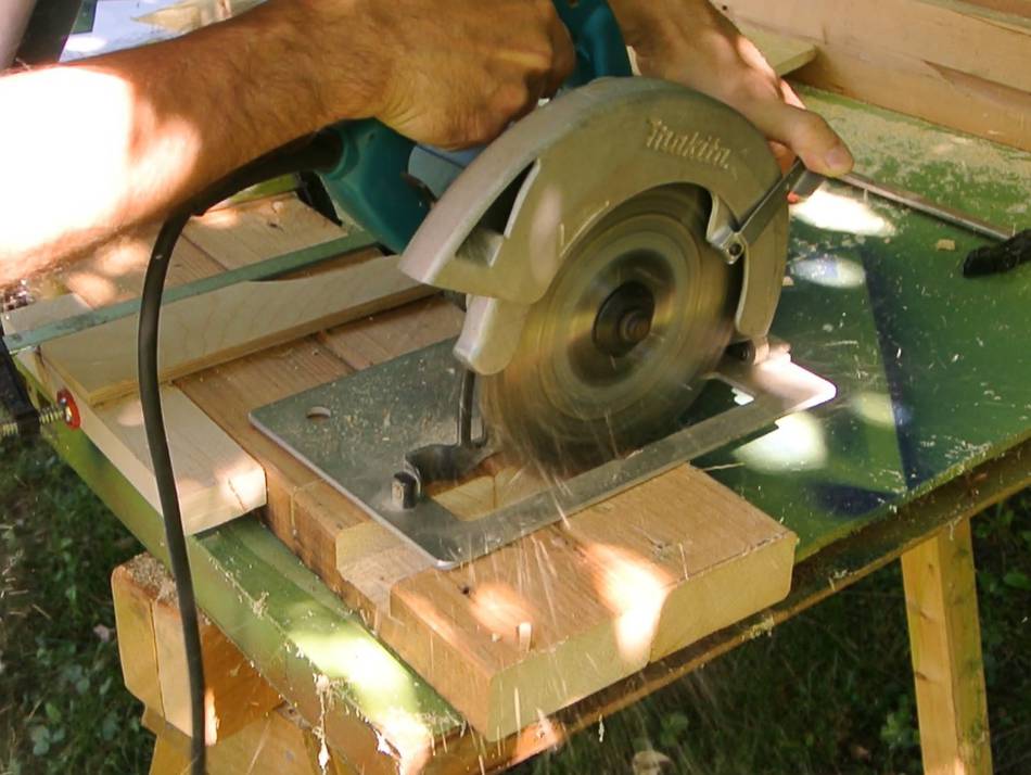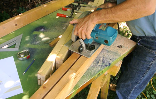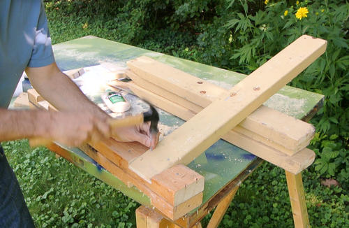 I had some old painted 2x4s from a picnic table (which, ironically, was my temporary workbench when I previously built sawhorses). A circular saw will cut most of the way through a 2x3, but it's one inch shy of cutting through a 2x4.