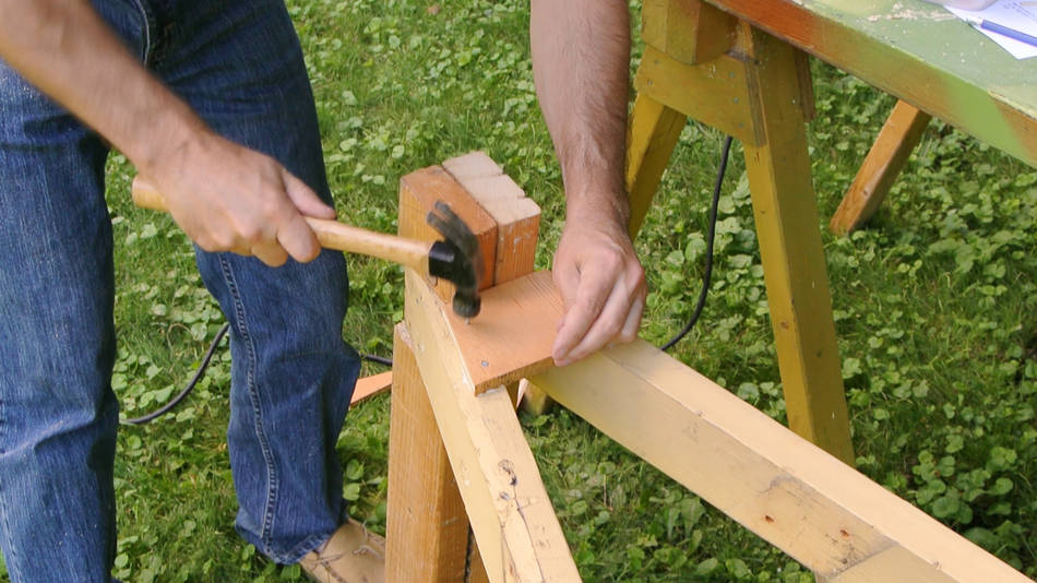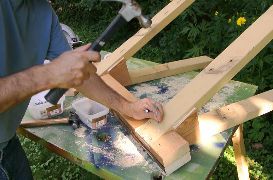 With the gussets nailed on, I drive a few 4" long nails through the leg, the beam,