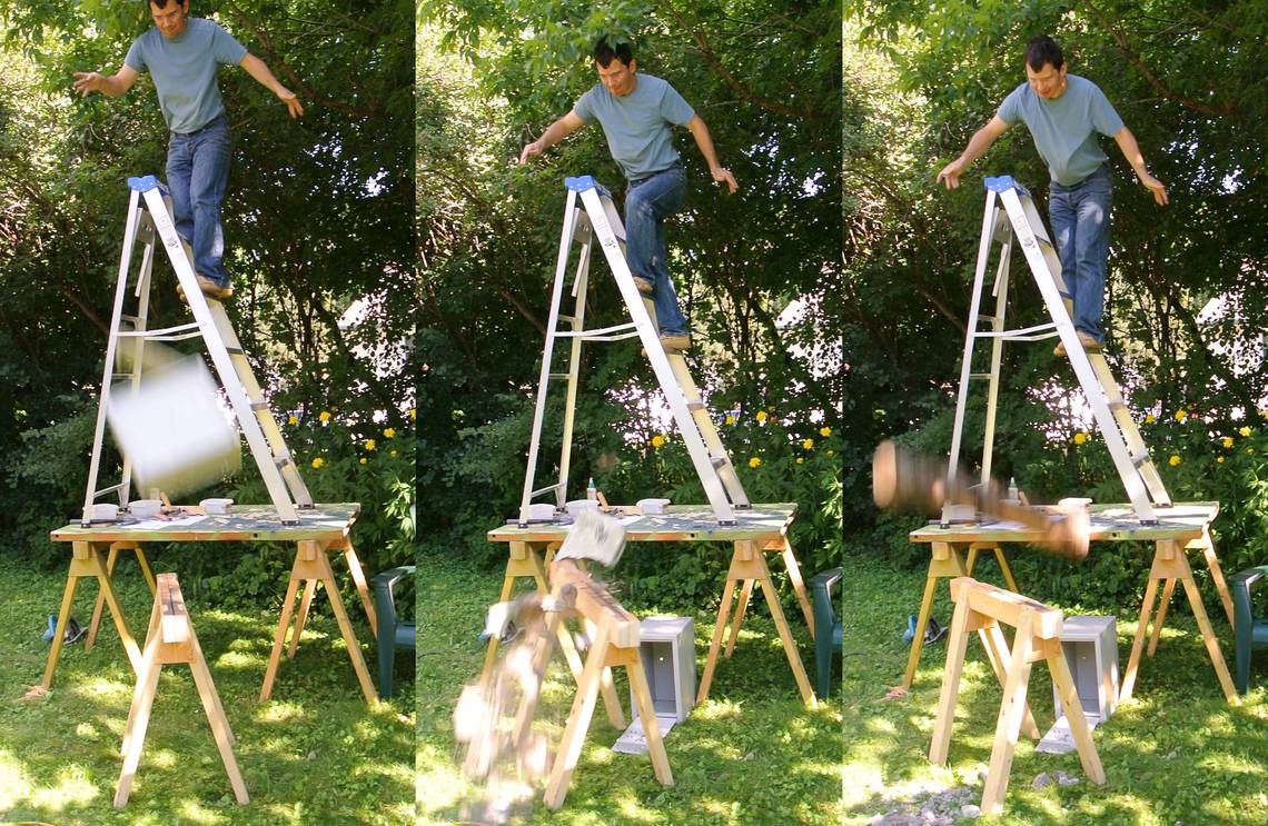 I thought I'd take it up a notch by dropping some heavy objects onto the sawhorse from a good height. First I dropped a safe, then a concrete block (which crumbled on hitting the sawhorse), then a small log. The top of the sawhorse ended up a little dented, but it withstood all three tests.