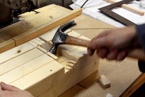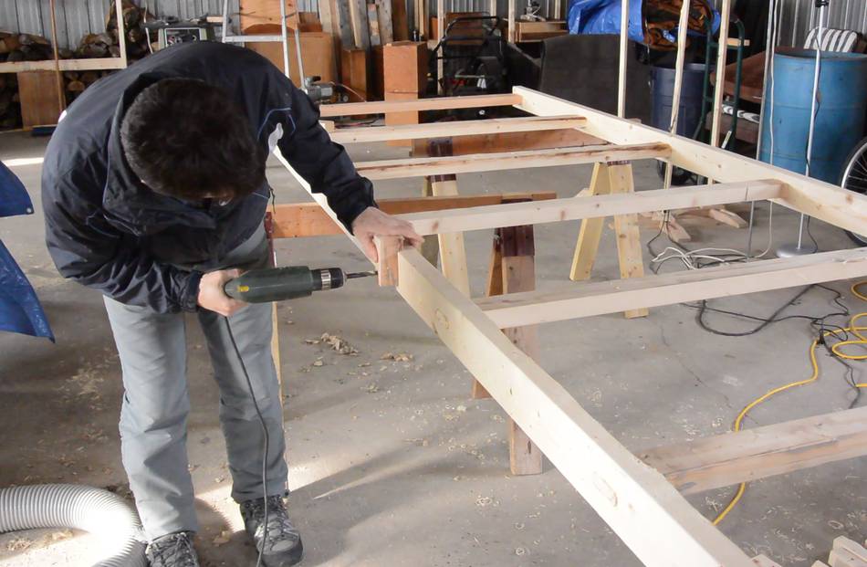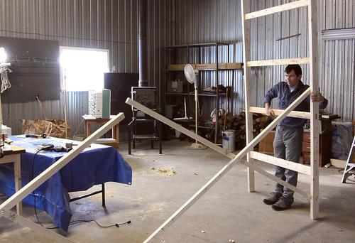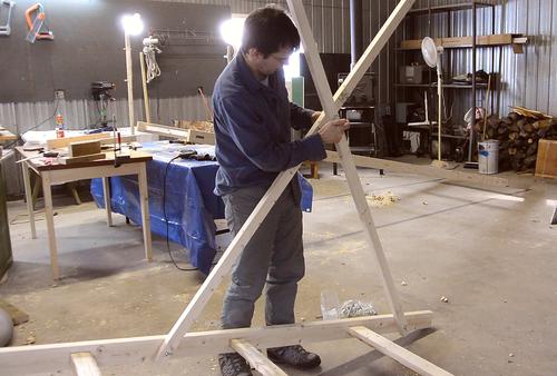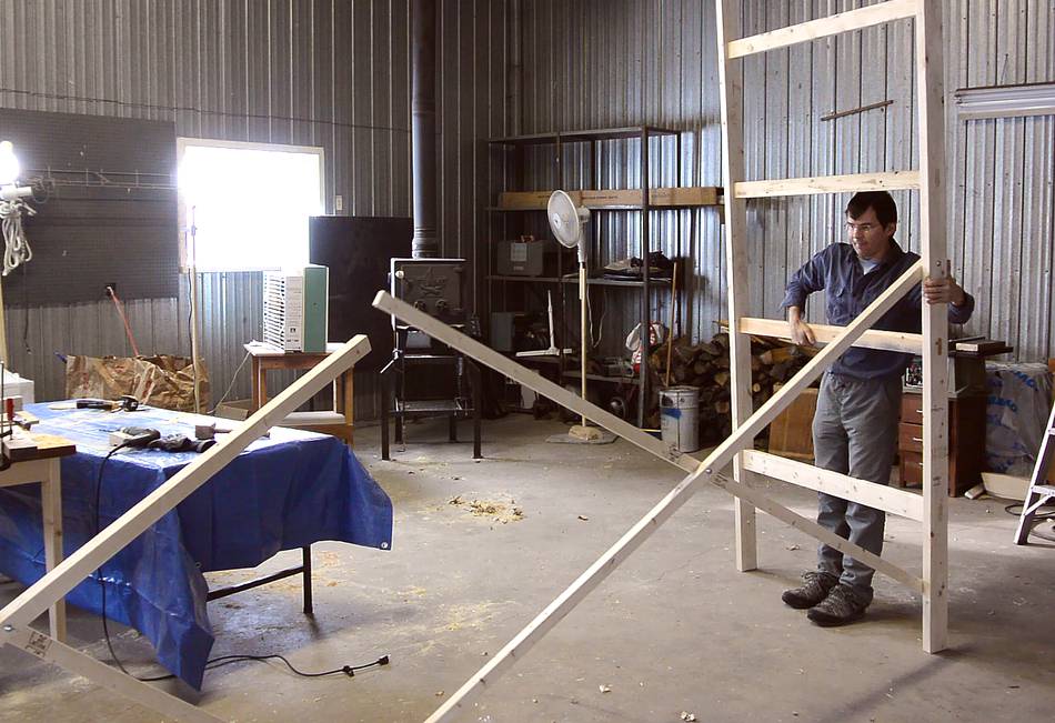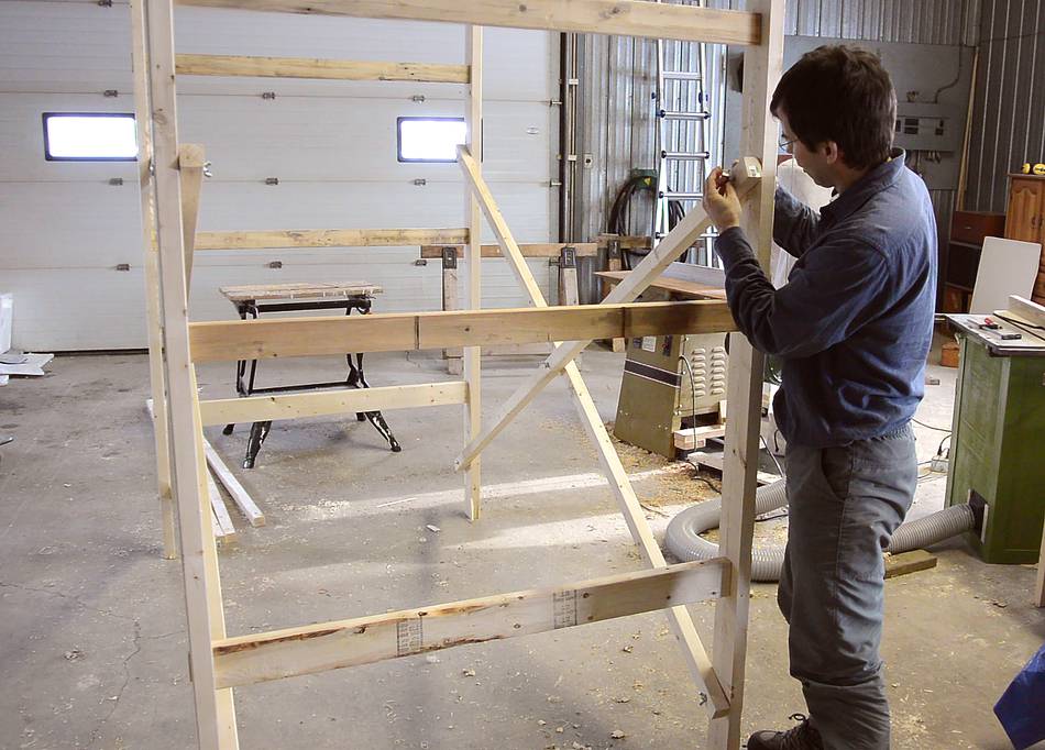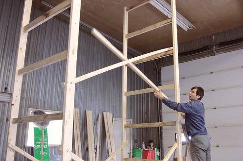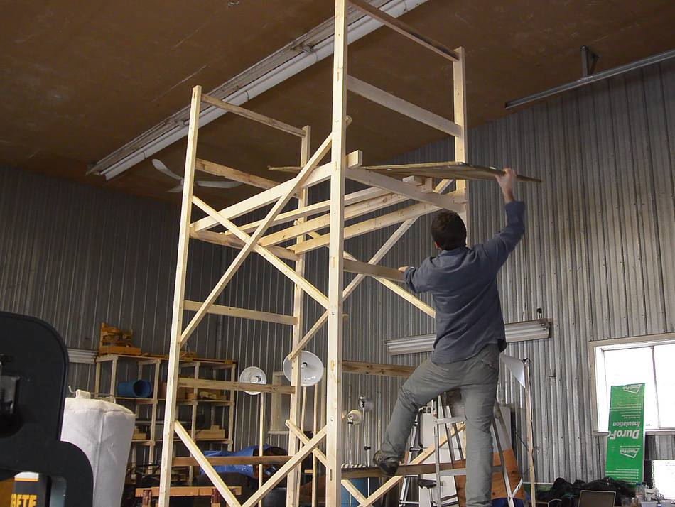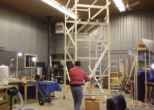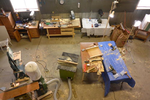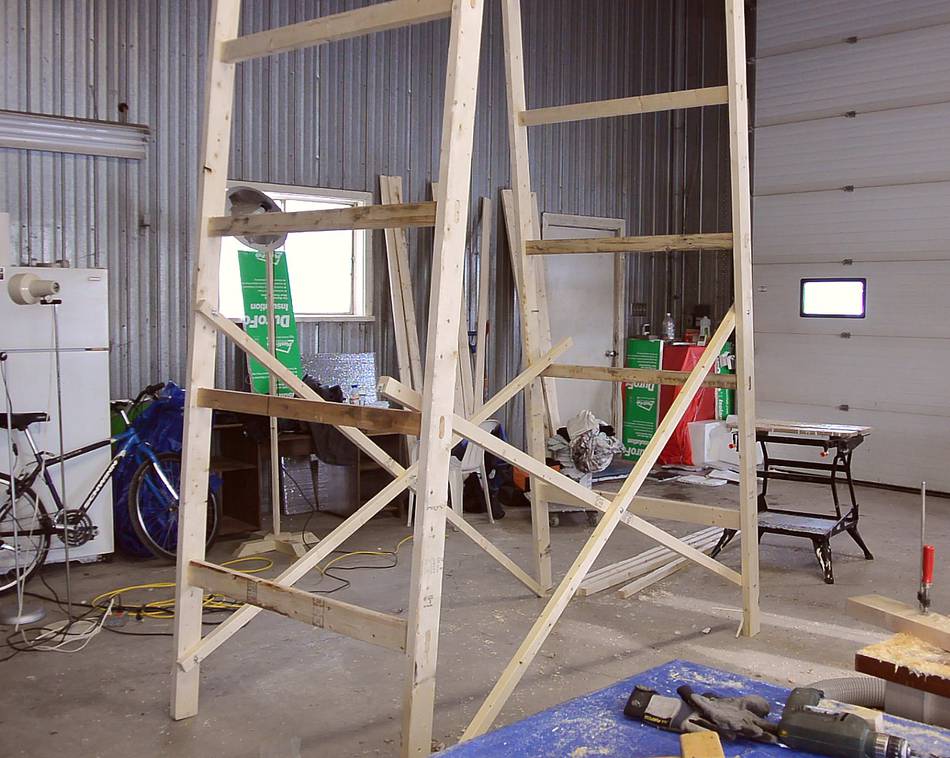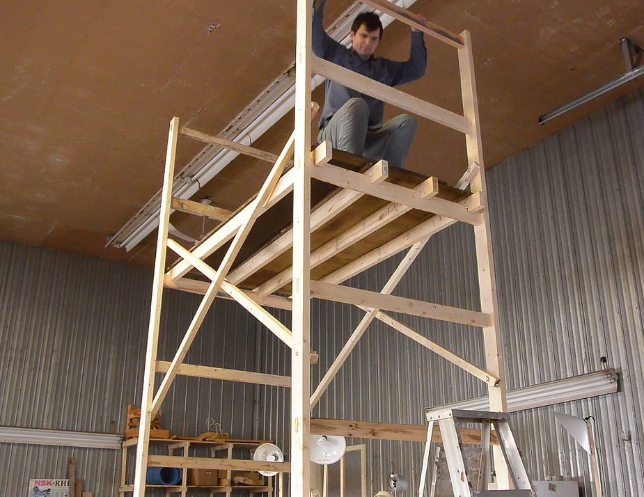 Looking down from the scaffold. You can see my homemade table saw hooked up to cheap dust collector. To the right of that a table I use as a workbench, and against the wall my mortise and tenoned workbench against the wall I screwed a 1x4 diagonally against each ladder. That eliminated most of the side-to-side wobble. The scaffold had gotten quite heavy at this point, but I was still, just barely, able to lift it by one side.