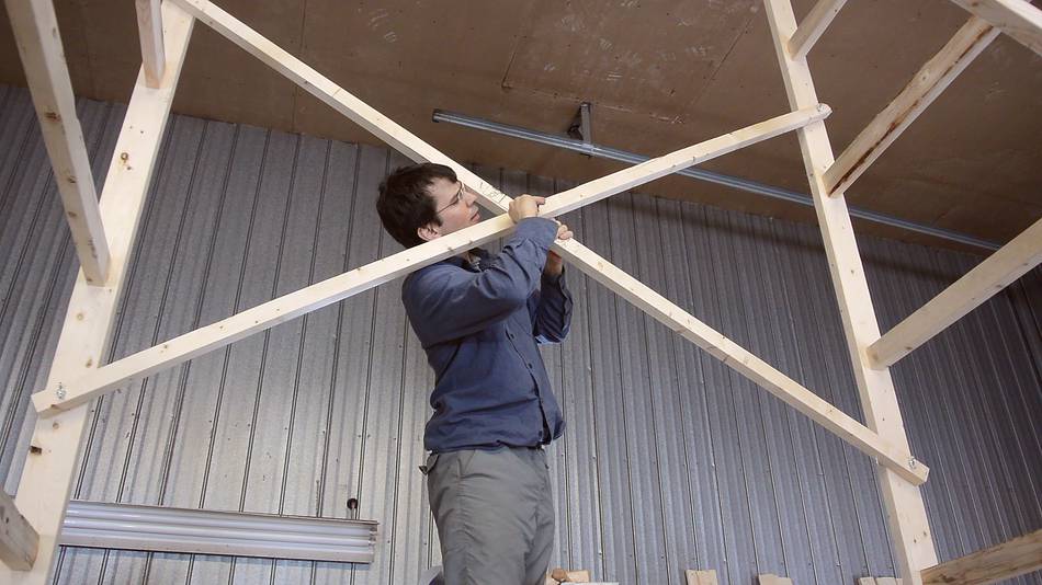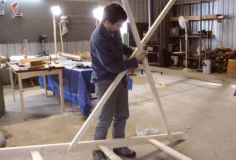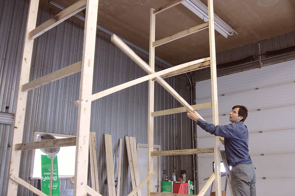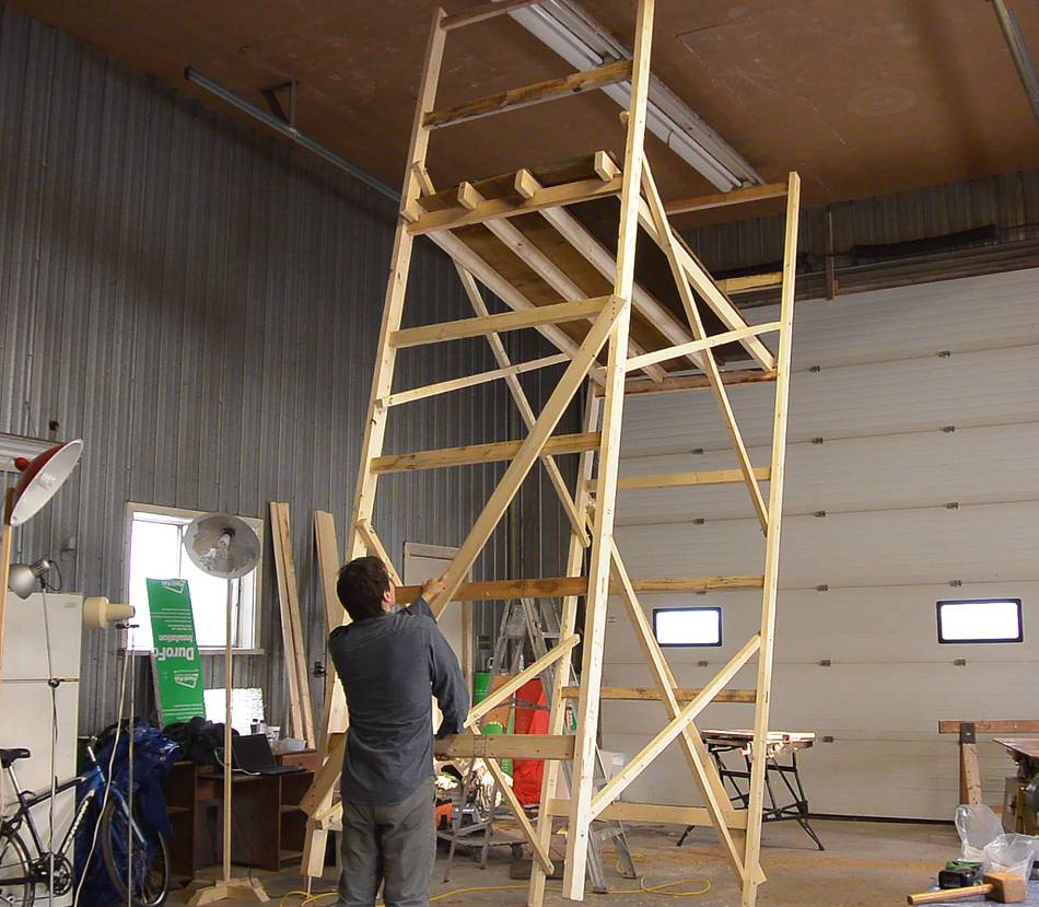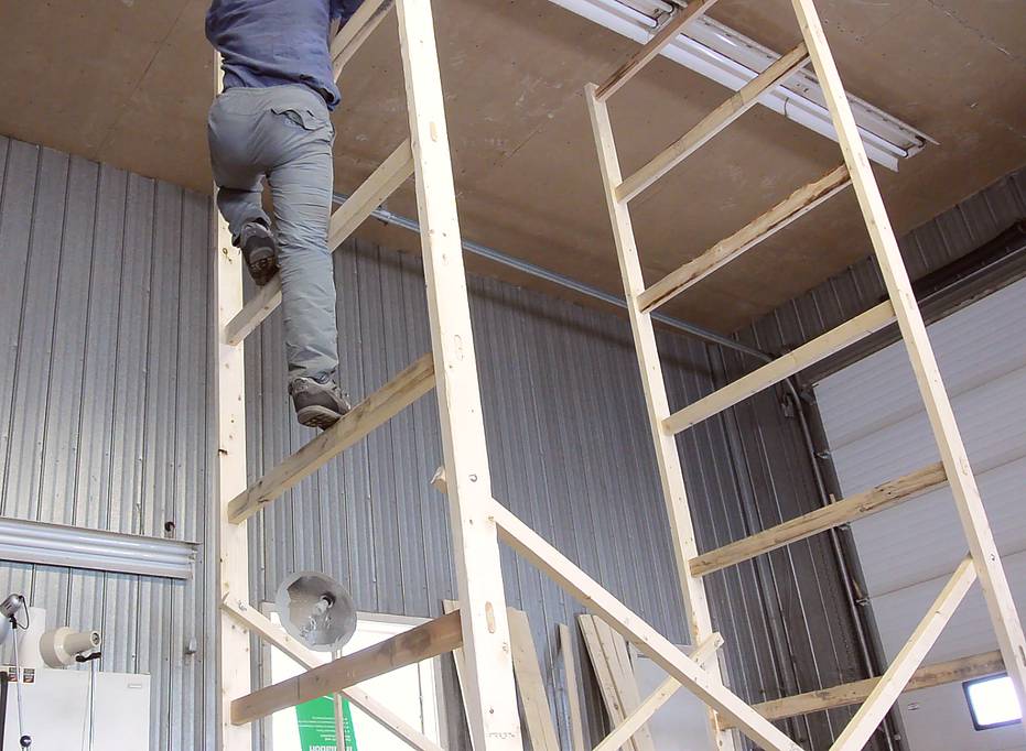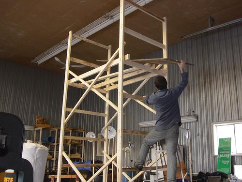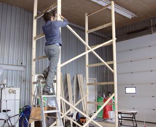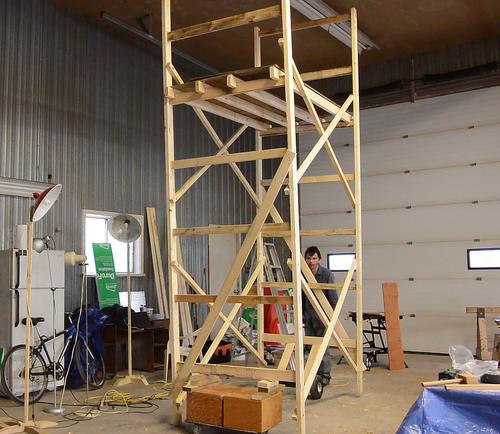 The cross braces allowed each ladder to lean against the cross brace to keep it from tipping over. After that, I bolted the cross braces to the other ladder. With just the first cross braces in place, the scaffold already held together. Out of curiosity, I climbed one of the ladders to the top. A bit wobbly, but it held.