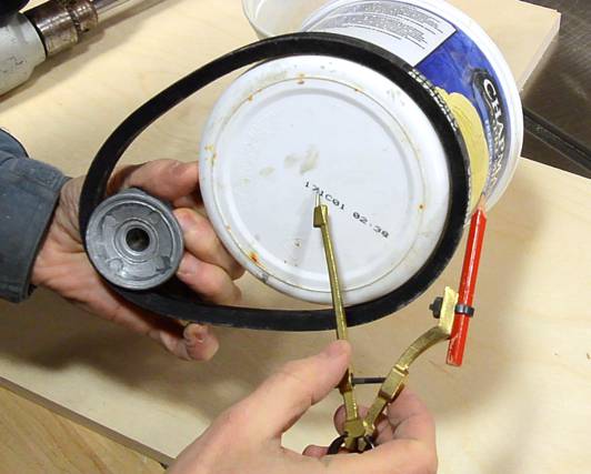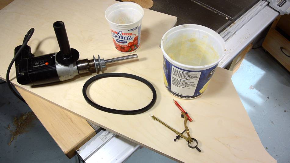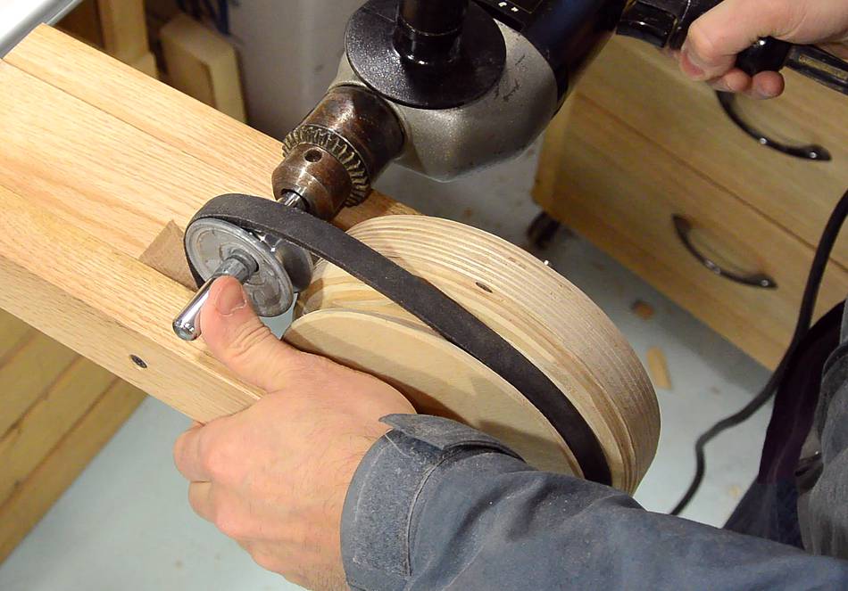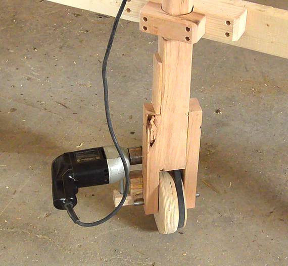 I have this old 550 RPM fixed speed, non reversible drill that I rarely use. With a 2" pulley on a steel shaft, I could use that to drive a belt driving a wheel. So I bought a short belt (the only part I had to buy), and then figured out what size wheel would work best with that.