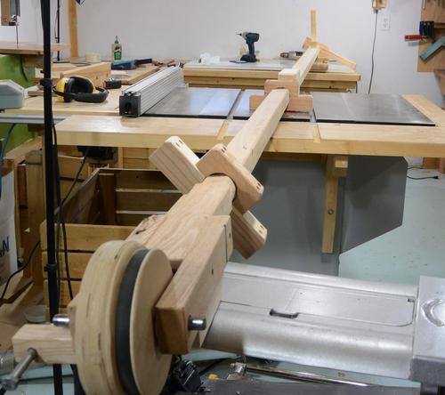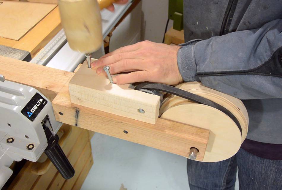 I made a block of wood to hold the shaft, with a notch for the pulley.