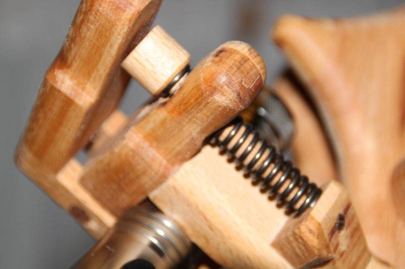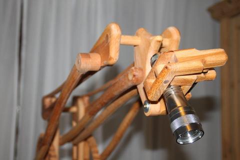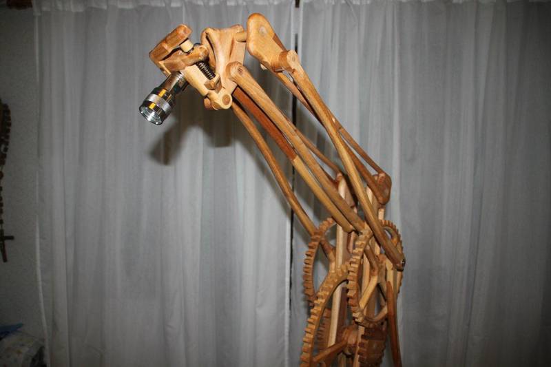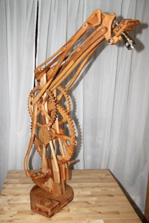 Michael Schultheiss sent me some pictures of his latest contraption: A beautiful "geared" desk lamp. Hi Matthias, Once again I tinkered in my basement, maybe you like what I built. Saw a picture of a similar lamp, and built one like it. Works pretty well. I installed the "marble" bearing once the weight of the lamp got too heavy for the gearing. Now it turns so easily that gearing isn't needed anymore.