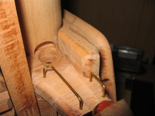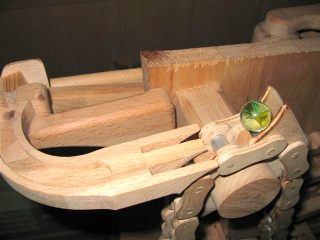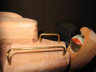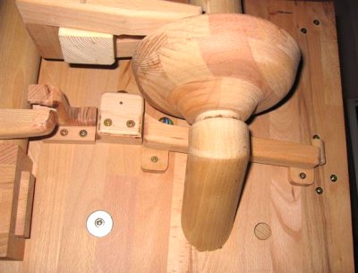 Some detailed shots of the elevating lever, which is on the right of the machine. The last of these photos shows the output of the elevating lever, feeding into the marble pump. The elevating lever is attached to the slider part of the marble pump, so that the lever moves up and down in sync with the pump.