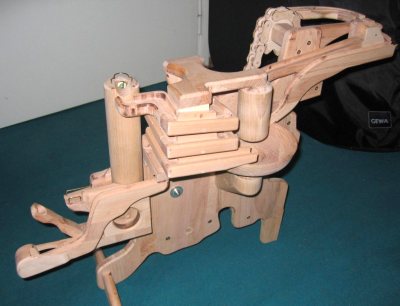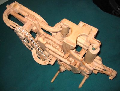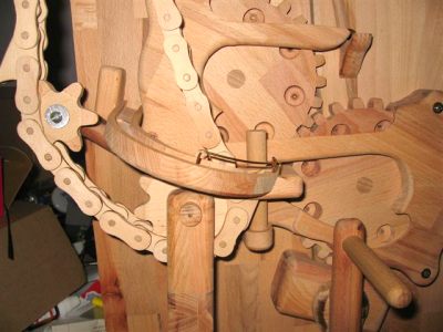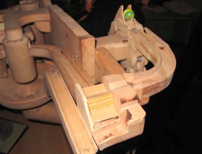 Michael Shultheiss's marble machineMichael Shulteiss sent me some pictures of his amazing marble machine. I very much enjoyed oogling these photos and figuring out how his machine works. Its a truly amazing machine.So, with Michael's permission, I am posting the pictures of his machine for others to enjoy as well. Larger versions of the first three photos can be viewed by clicking on them. The machine is hand cranked. It uses several elements that I also employed in my marble machines - the geared marble elevating wheels, the flipflop, and the marble pump. It was a challenge for me to figure out this machine. I ended up drawing a sort of flow diagram of it to figure out completely. The flipflop, center right, is mostly hidden from the view above, but key to understanding the flow.