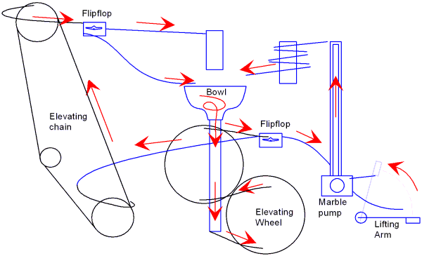 Its best to understand the flow starting from the bowl. The bowl feeds the geared elevating wheels, which in turn feed the flipflop at center right. Half the marbles subsequently go through the elevating chain, while the other half go to a very clever lifting arm, which in turn feeds a marble pump.
