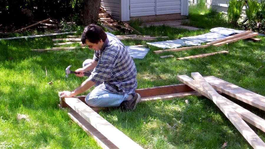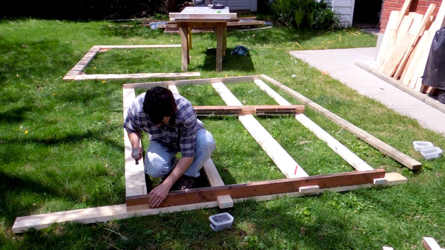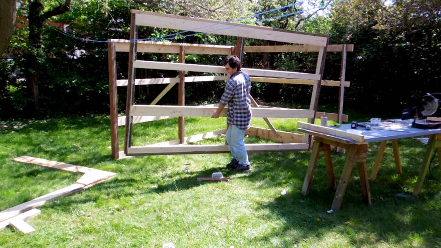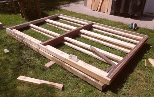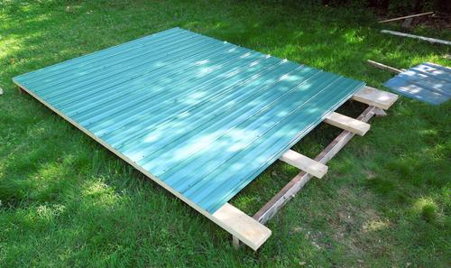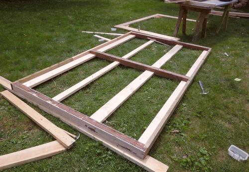 I built the roof structure separate from the shed. I put two old doors down on