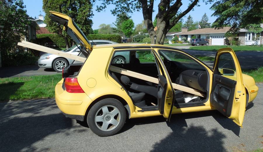 What I love about hatchback cars is that they are quite good at moving long stuff. Even with a full size pickup truck, the 12' 2x4's would have stuck further out the back than they do with my car!