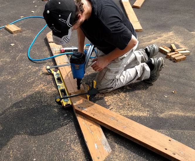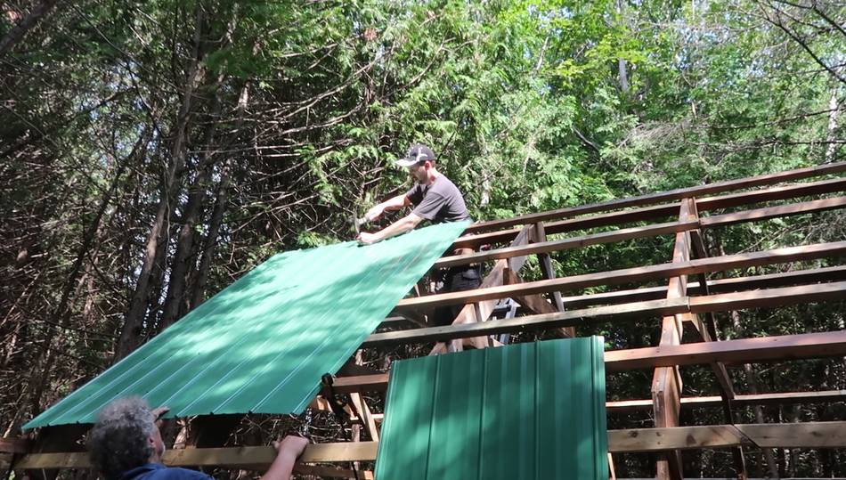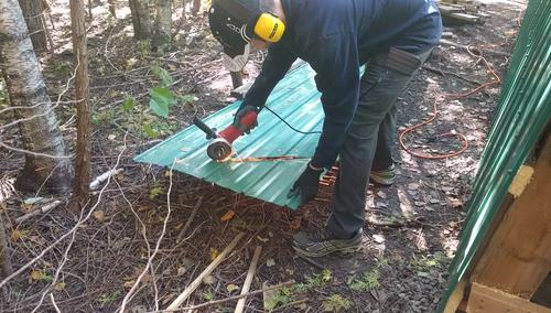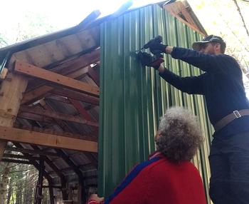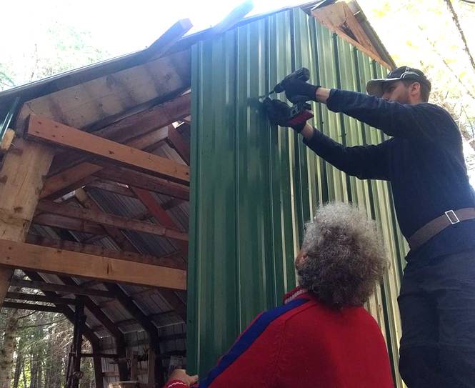 Screwing on the sheet metal. Matt used an awl and a hammer to pre-punch small