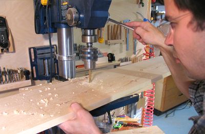 on the drill press, which was not so easy when balancing the big board on the small drill press table.