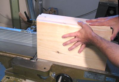 I started by cutting the pieces for the bookcase's shelves to length. The next step was to plane one edge of every shelf on the jointer. That way, I was sure that one side of the shelves was a straight edge, and free of any nicks. I planed a stack of four of these at a time on the jointer.