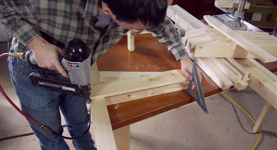 I then flip the shelf assembly over to glue and nail a board