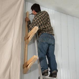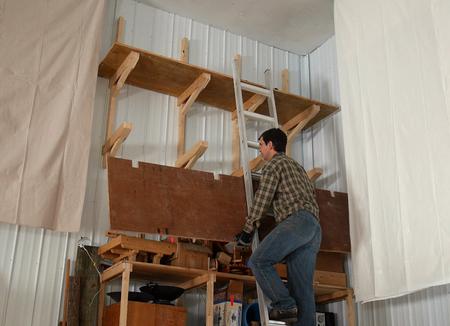 With the ladder leaning against the wall, getting the plywood