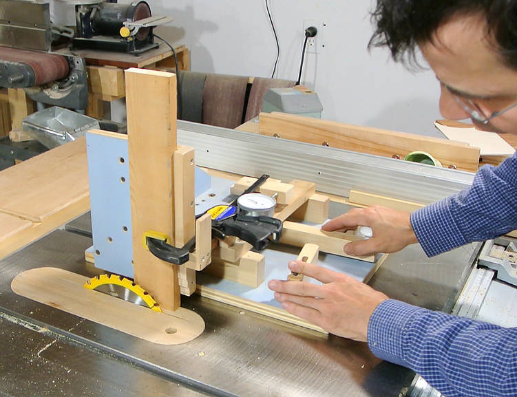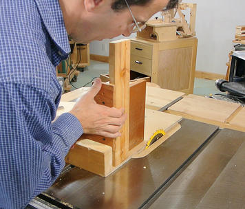 A tenon jig can be as simple as a box to put on a table saw sled (left), or could be a commercial tennoning jig (right), like the Delta tenon jig...