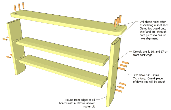 When putting the shelf together, put the sides and the two lower shelves together first. After that, securely clamp the top board onto the shelves, and then drill the dowel holes through the top shelf and into the sides. This will ensure that the dowel holes all line up properly. It's advisable to taper the ends of the dowels slightly, which will make it much easier to get them into both pieces, especially if there is a slight amount of misalignment.