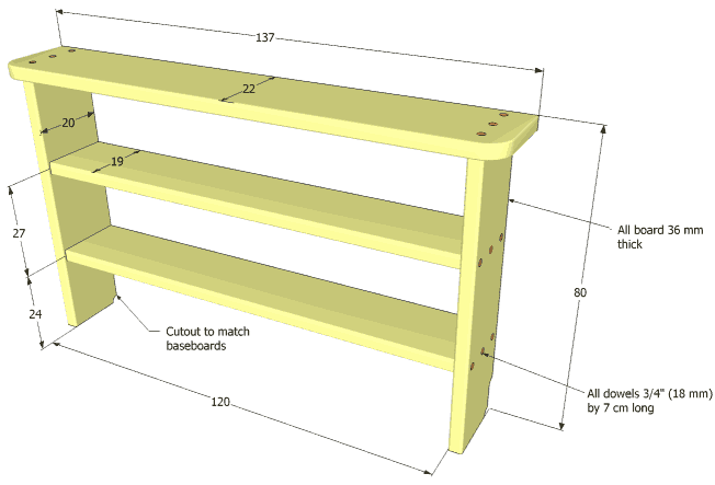 All dimensions are in centimeters. If you prefer to work in inches, divide the numbers by 2.5 to get inches. The shelf is built from construction lumber. One 12' 2x10 plus one 8' 2x8 will do for the boards. You will also need about 4' of 3/4" (18 mm) dowel.