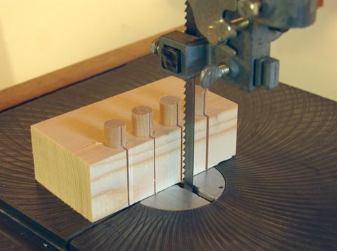 Then, put dowels in the hole, and cut just partly into each dowel with the band saw.