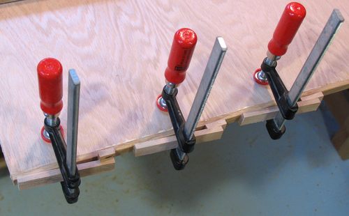 Edge clampingWhen clamping trim to the edge of a large piece of plywood, quite often it's too far to the other side to clamp across the whole piece.At this point, edge clamps are called for. Though it's rare that I find myself needing some sort of edge clamp, when I do need them, I need a lot of them. But I'm not interested in buying a lot of clamps that I would rarely use.