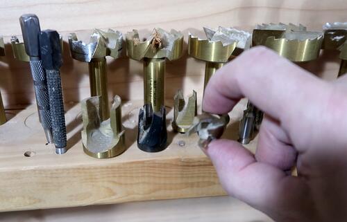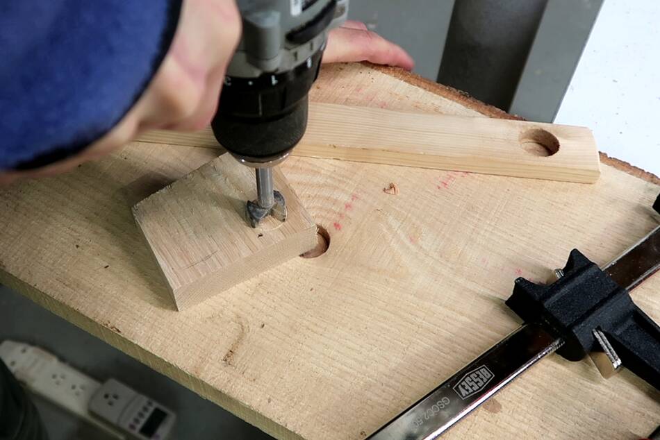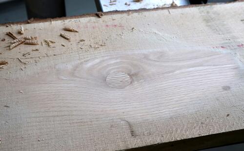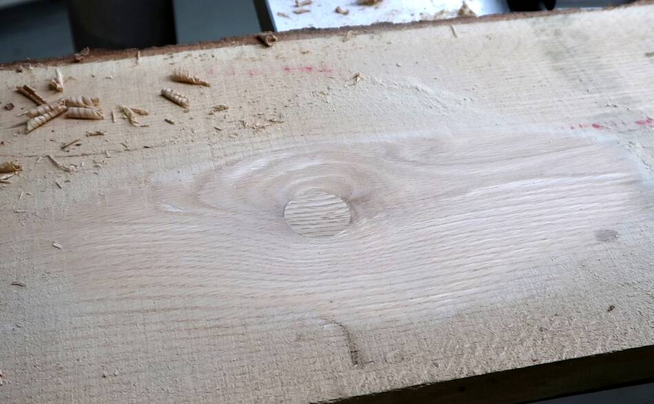 When drilling out defects, it helps to clamp a piece of wood with a hole in it over where to drill to guide it even if the center prong doesn't have anything to bite into (see scrap piece with a hole in this picture). This is also a good idea if there is a risk of slipping with the drill and marring the rest of the wood.