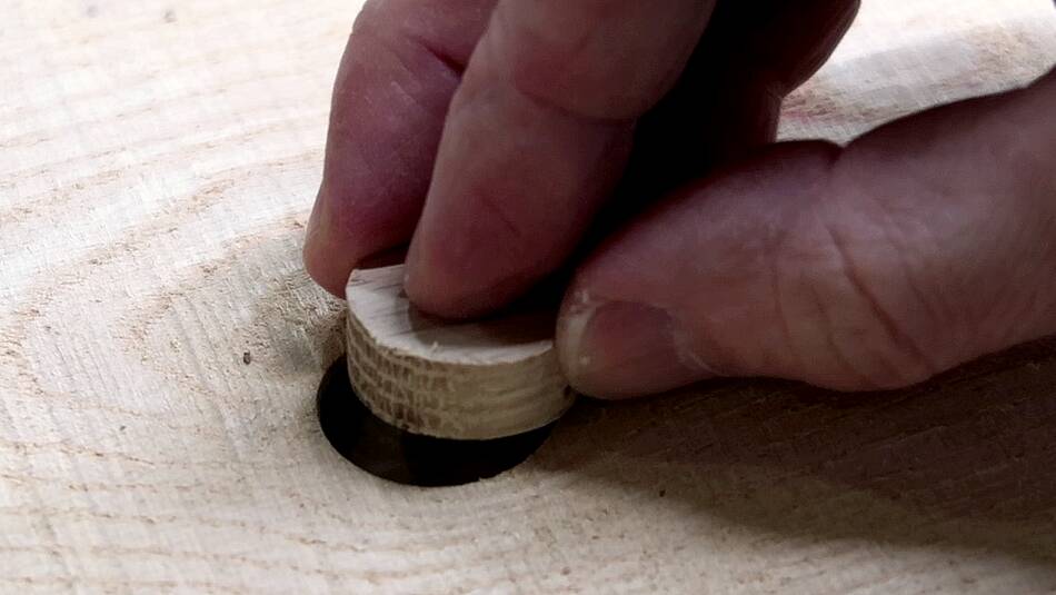 After checking the fit, I put glue around the plug and the hole, hammer it in, then cut it flush and plane it flush.