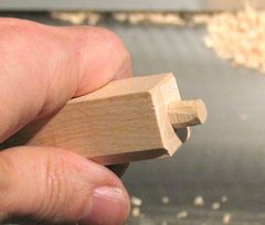This one again pivots on short tenons in the work piece, although if I was making a lot of cones like that, I'd probably have pins sticking out of the jig pivoting on holes in the work piece. For thinner work pieces, like the chair spindle, a tenon in the work piece makes more sense though.