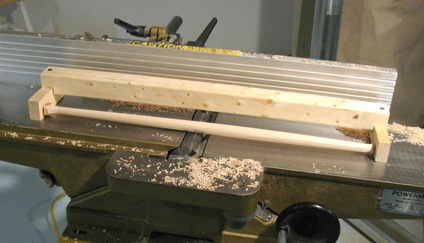 I was recently repairing a chair of the type with the arching back and a series of spokes or spindles going from the seat to the arch. The chair was missing one of the spindles, so had to make a new one. I didn't think turning such a long and thin spindle on a lathe would be a good idea, and carving one out with a spokeshave would have taken too long to get it right. So I thought up a neat method of doing it on a jointer. I'd used a similar technique for making the drum of my apple grinder on my jointer so decided to try it for a narrower spindle.
