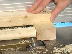 Then, with the infeed of the jointer set fairly low, it's a matter of passing the jig and workpiece over the jointer, and rotating the workpiece for each successive cut by a little bit. The result is a cone.
