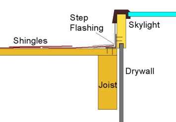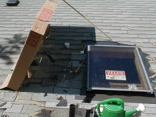 As I was installing the flashing and shingles, the day was getting warmer. To work with shingles, its best if they are not too cold, and not too hot. But a sunny summer day is much warmer than ideal, so I wetted the shingles to cool the area I was working on down a little bit. Later, I even used part of the box that the skylight came in to provide some shade.