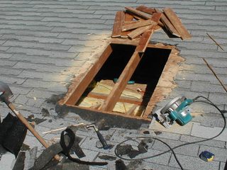 The next step was to remove the shingles in the area. A shovel (the kind used for digging soil) works best for removing shingles. After that, I cut the roof sheathing with a circular saw.