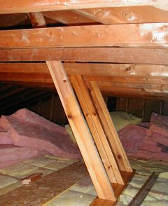 I added some extra 2x4's to support the ridge of the roof in the area that I would cut away. I added these to the rafter that I would cut out, plus one to the rafter on either side, for good measure. The 2x4's are supported by the ceiling joists just above a supporting wall below.